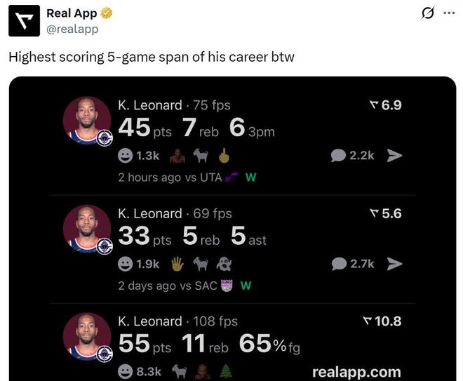 過(guò)去5場(chǎng)比賽,小卡合計(jì)轟下202分,創(chuàng)造其個(gè)人職業(yè)生涯連續(xù)5場(chǎng)比賽總得分新紀(jì)錄。