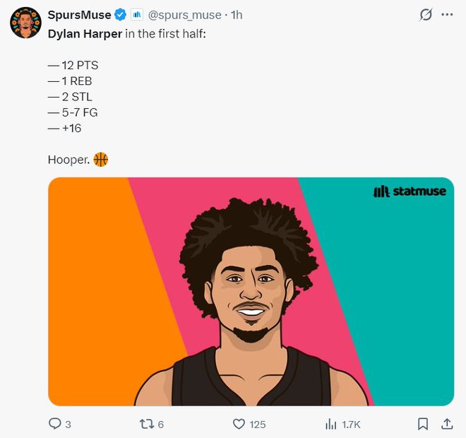 因為馬刺的后場過多(福克斯、卡斯?fàn)?、瓦塞爾、凱爾登、麥克勞林、哈珀),所以作為新秀的哈珀登場時間就20分鐘左右,但此役瓦塞爾受傷了,麥克勞林輪休,哈珀首節(jié)就打了7分鐘,很明顯他獲得了瓦塞爾的輪換時間,上半場16分鐘,7中5拿到12分2搶斷1籃板,正負值+16。